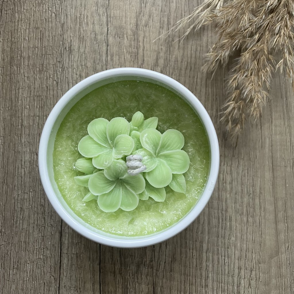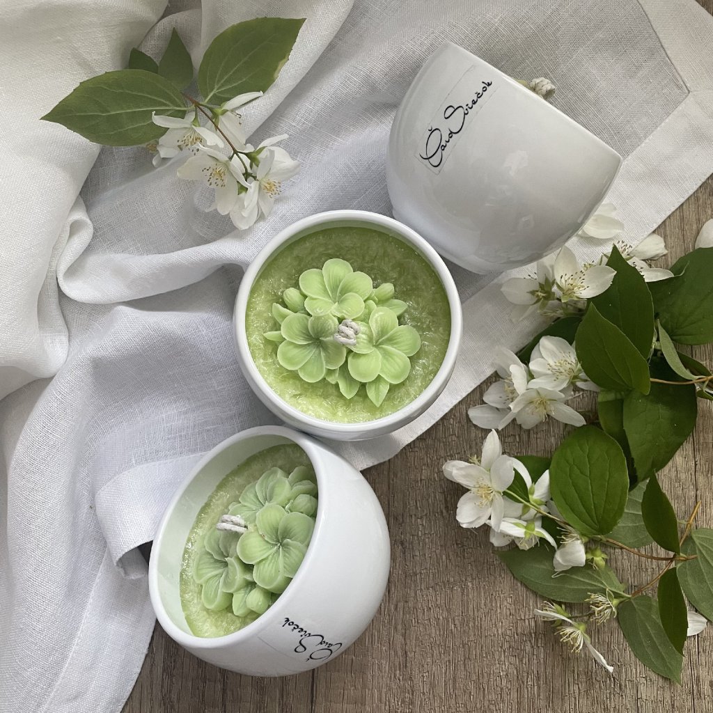 Ručne odlievaná sviečka dekorovaná kvietkom z vosku. Vôňa jazmínu je sladko-kvetinová. Táto sviečka bude skvelým spoločníkom na dlhé letné večery na balkóne či terase. Vhodná ako originálny darček. Dlhší knôt je ozdobne zvinutý. Pred zapálením je potrebné skrátiť knôt na cca 0,5 cm.