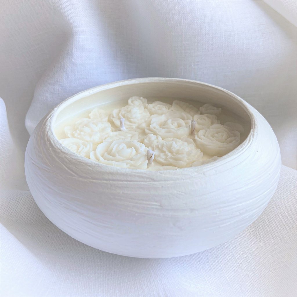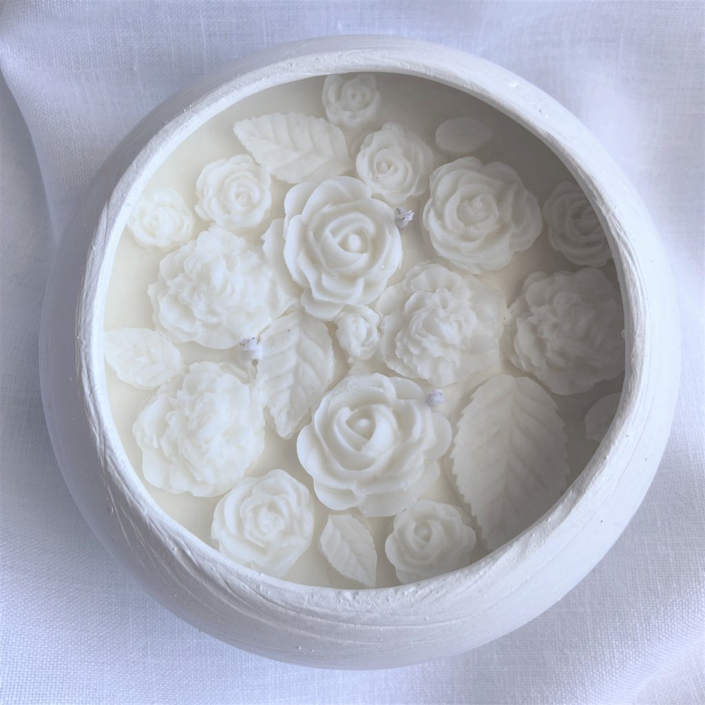 Ručne vyrobená sviečka zo sójového vosku s troma knôtmi Vás očarí jemnou kvetinovou dekoráciou. Plastické kvietky sú taktiež vyrobené z vosku. Sviečka má tri knôty a je zaliata do okrúhlej keramickej nádoby. Každý kúsok je originál, ktorý vzniká podľa inšpirácie v danom momente, preto nemusí byť úplne totožný s ilustračnou fotkou a môže mať mierne odlišnosti v usporiadaní či odtieni použitých dekorácií. Ak sa rozhodnete sviečku zapáliť, dodržujte odporúčané zásady bezpečnosti.