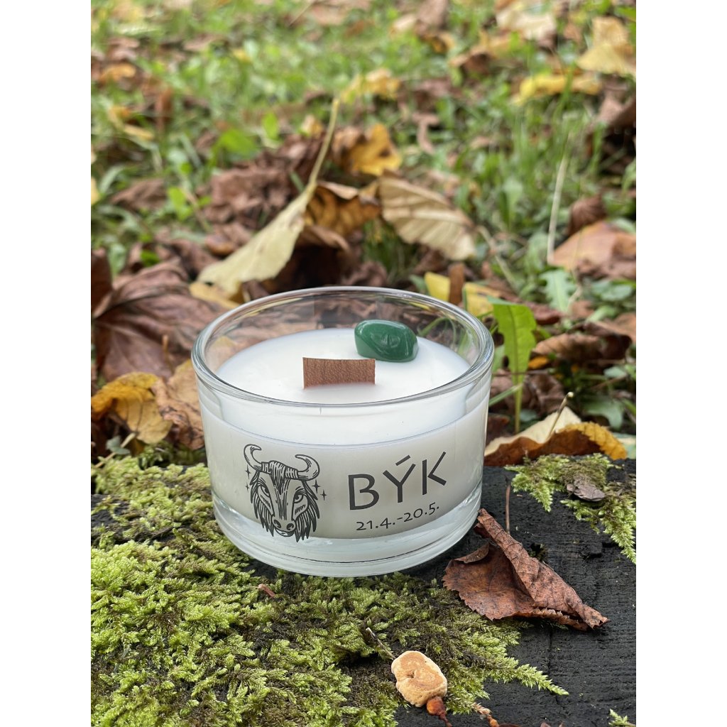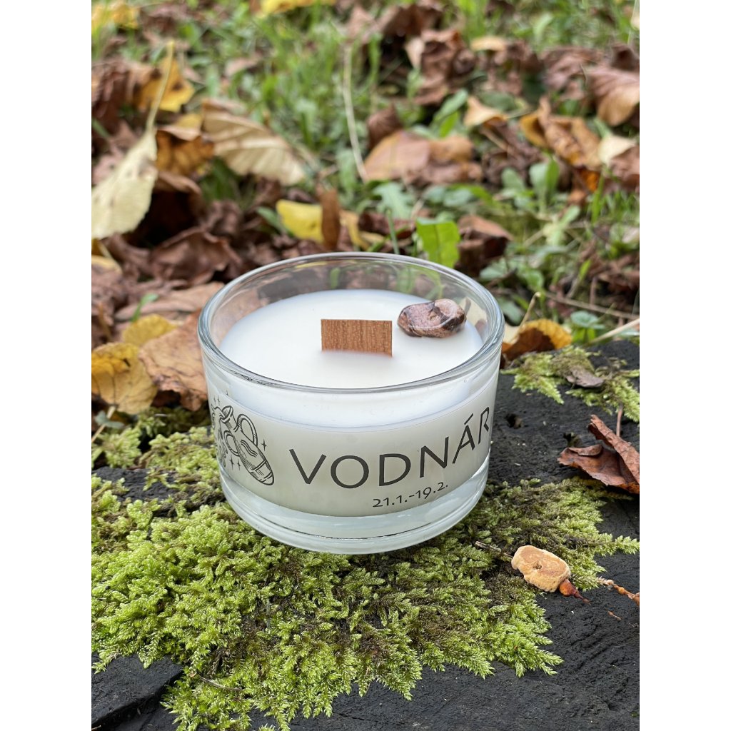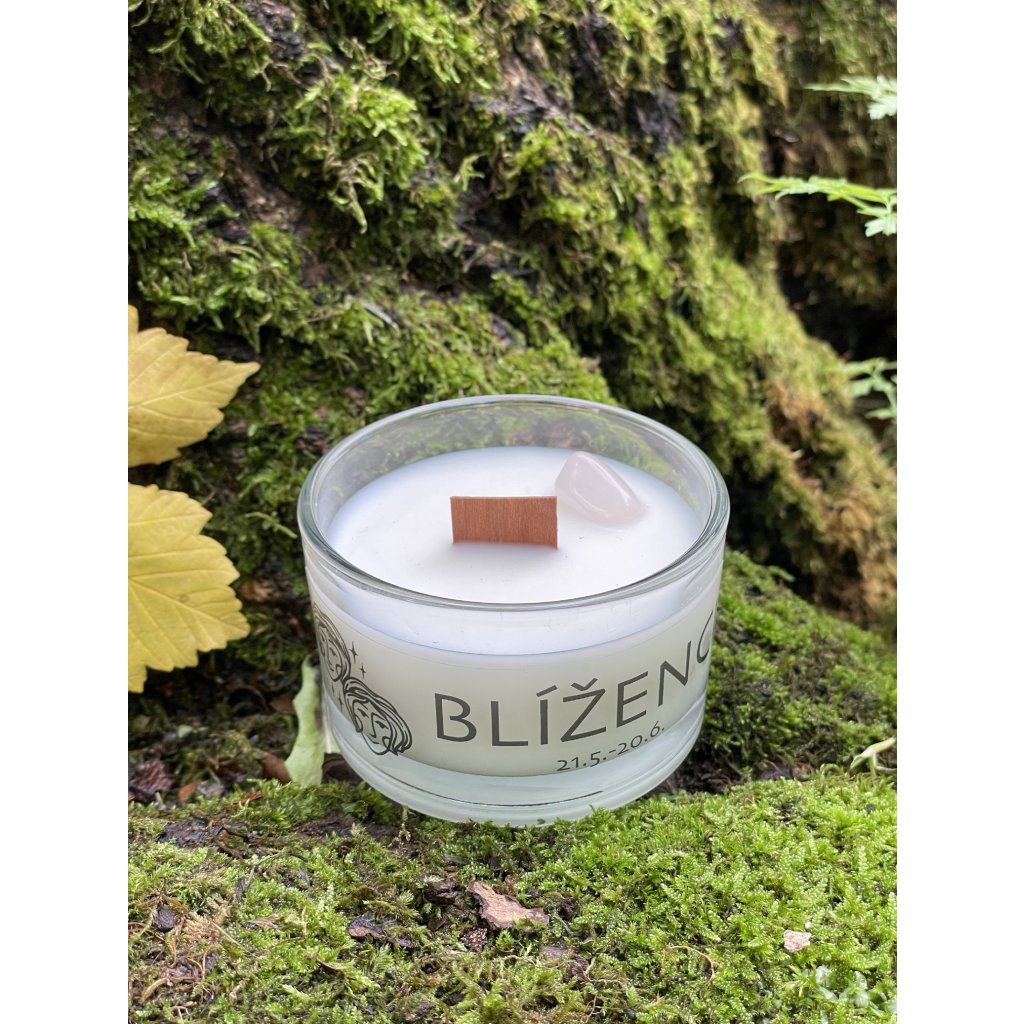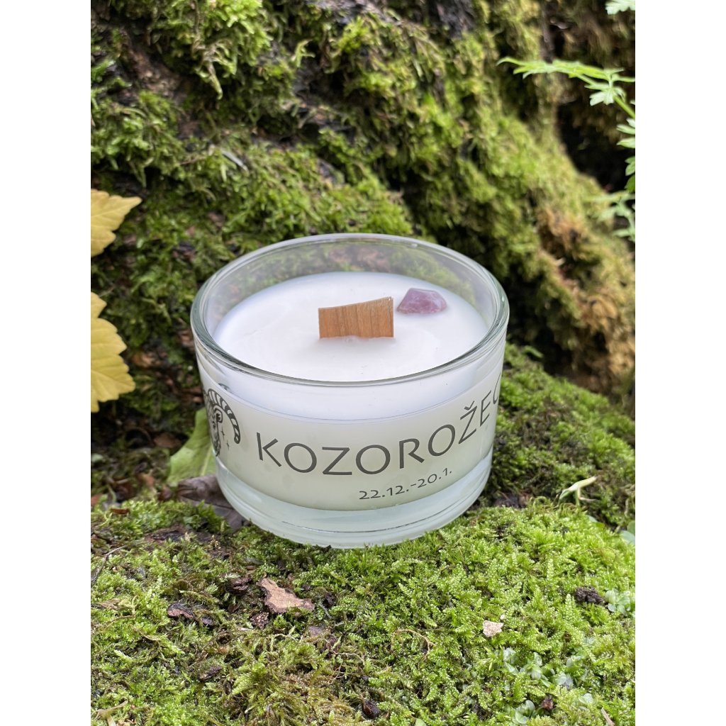 Sójová sviečka v sklenenom poháriku s dreveným knôtom. Vo vosku je osadený kamienok - minerál s energeticky ochranným a podporným účinkom pre osobu narodenú v konkrétnom znamení zverokruhu. Pri objednávke sviečky pre konkrétne znamenie Vám zašleme sviečku s jedným z minerálov uvedených nižšie. Do poznámky môžete uviesť Vašu preferenciu vône: citrónová tráva (Lemonograss) alebo zelený čaj s opunciou.