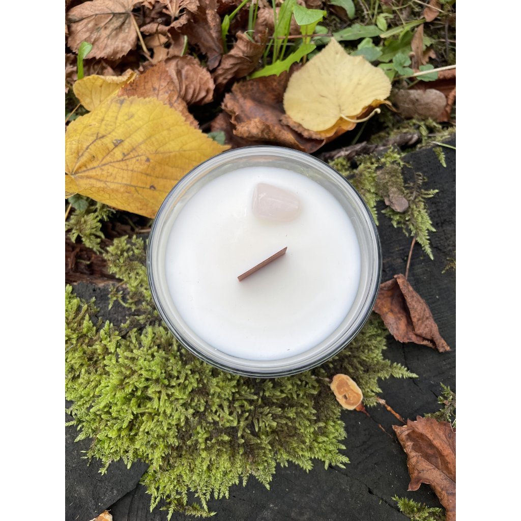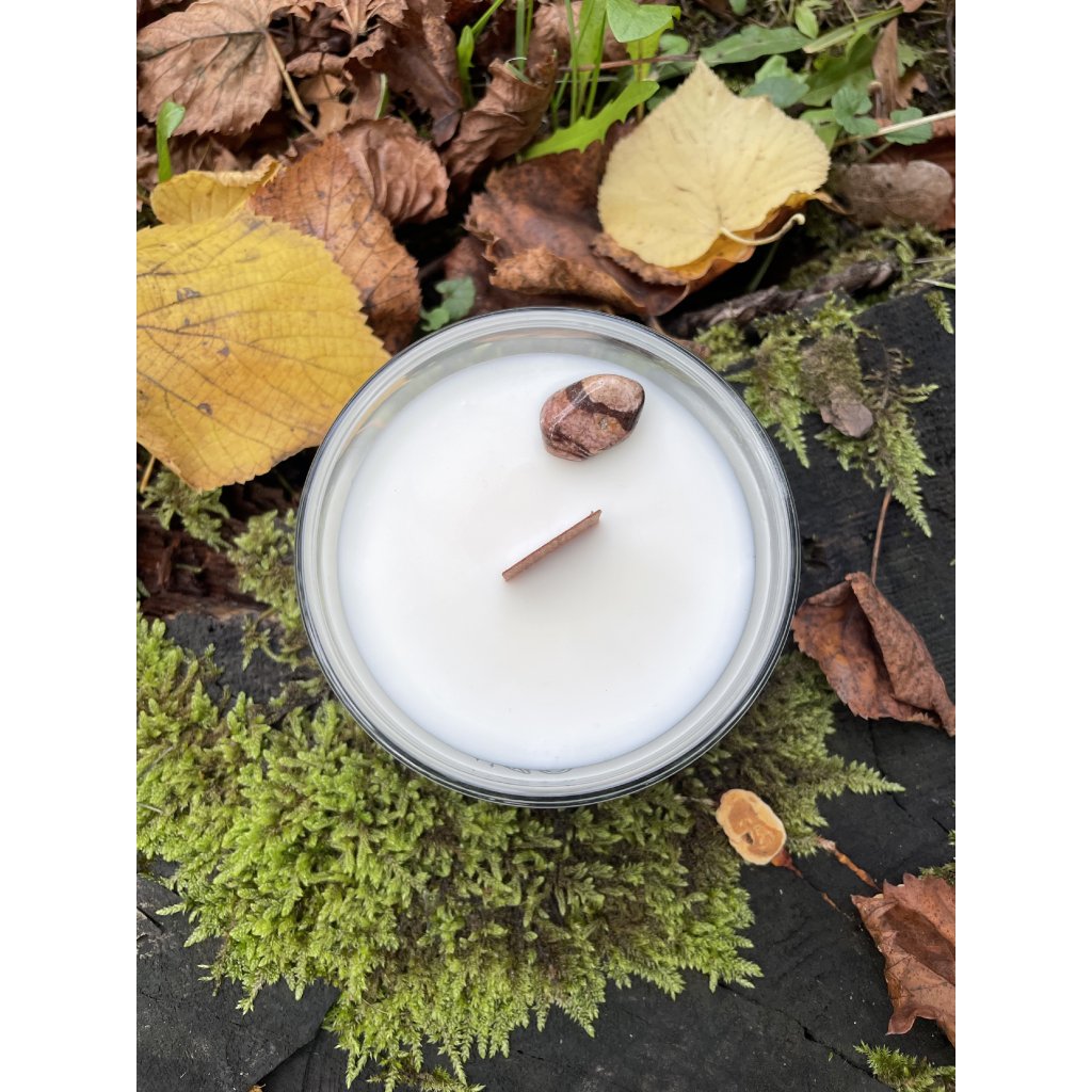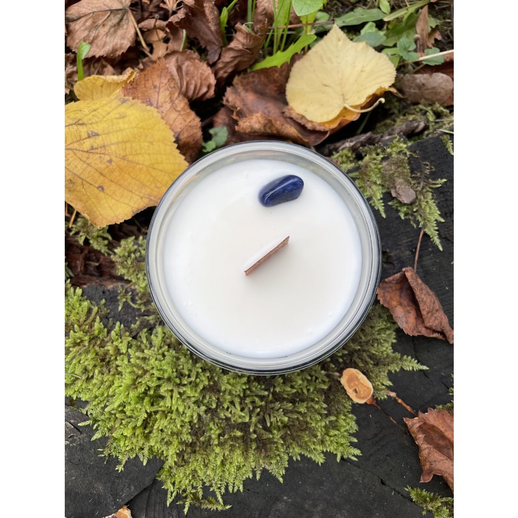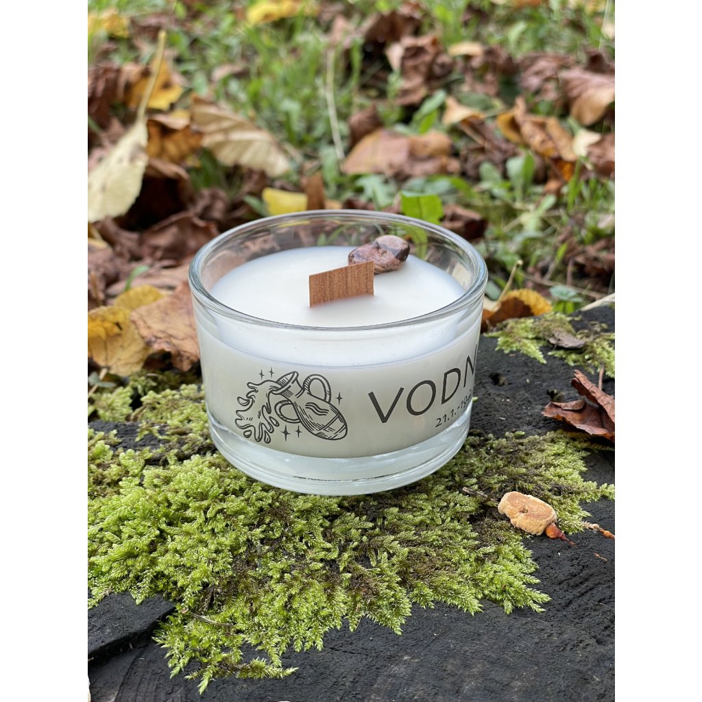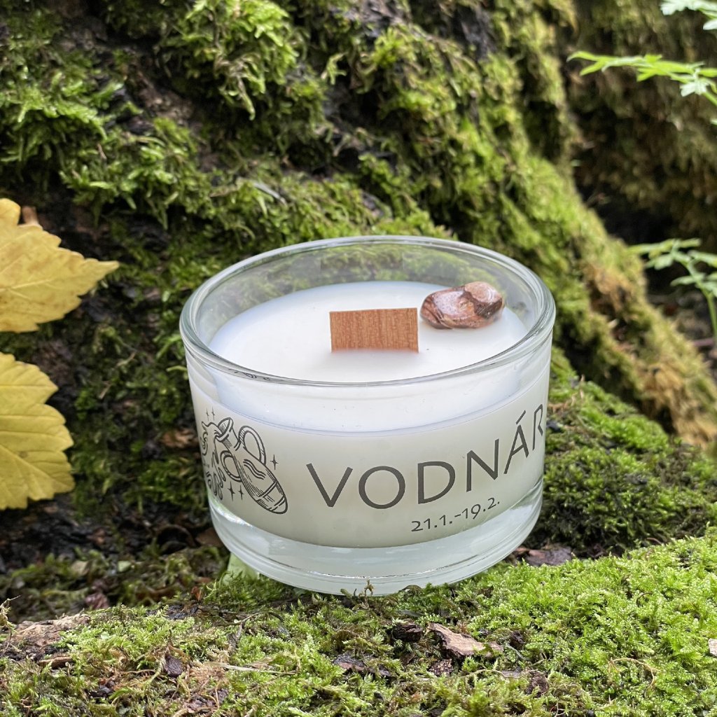 Sójová sviečka v sklenenom poháriku s dreveným knôtom. Vo vosku je osadený kamienok - minerál s energeticky ochranným a podporným účinkom pre osobu narodenú v konkrétnom znamení zverokruhu. Pri objednávke sviečky pre konkrétne znamenie Vám zašleme sviečku s jedným z minerálov uvedených nižšie. Do poznámky môžete uviesť Vašu preferenciu vône: citrónová tráva (Lemonograss) alebo zelený čaj s opunciou.