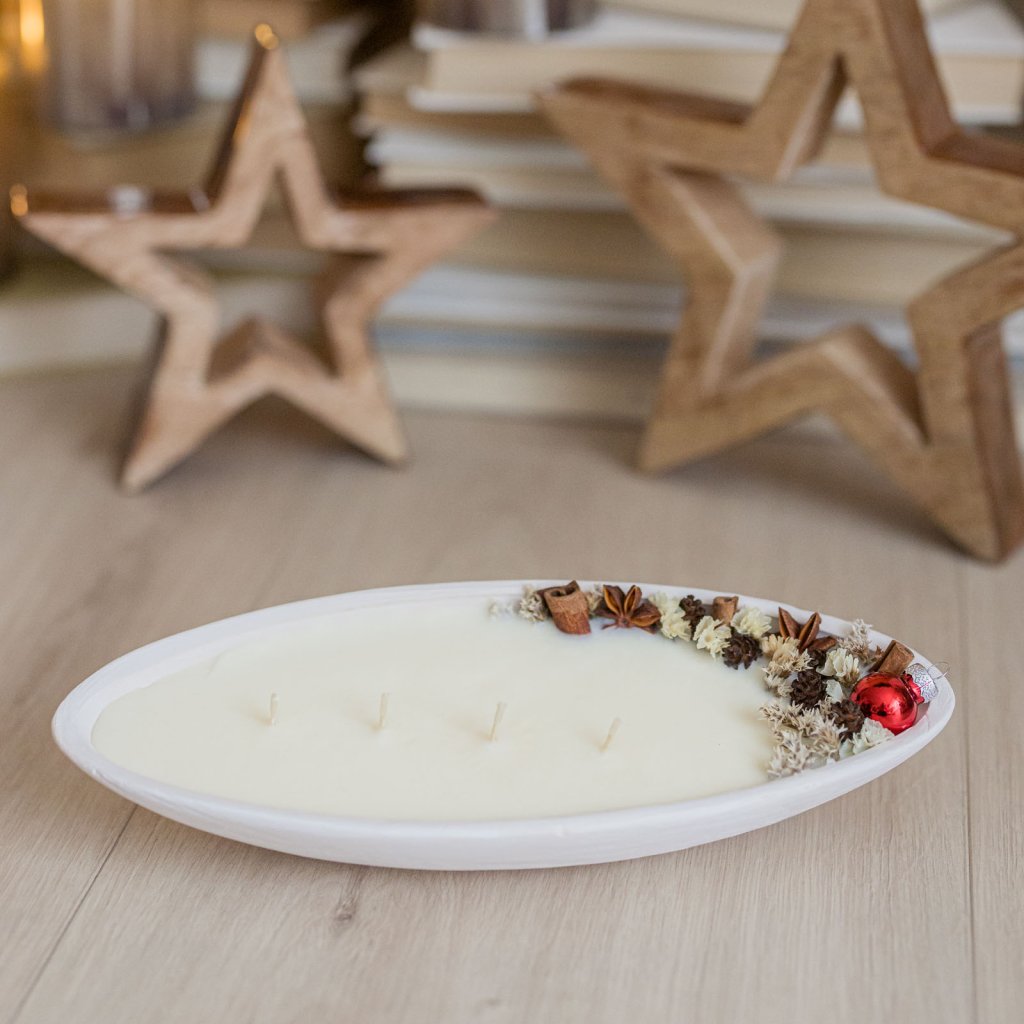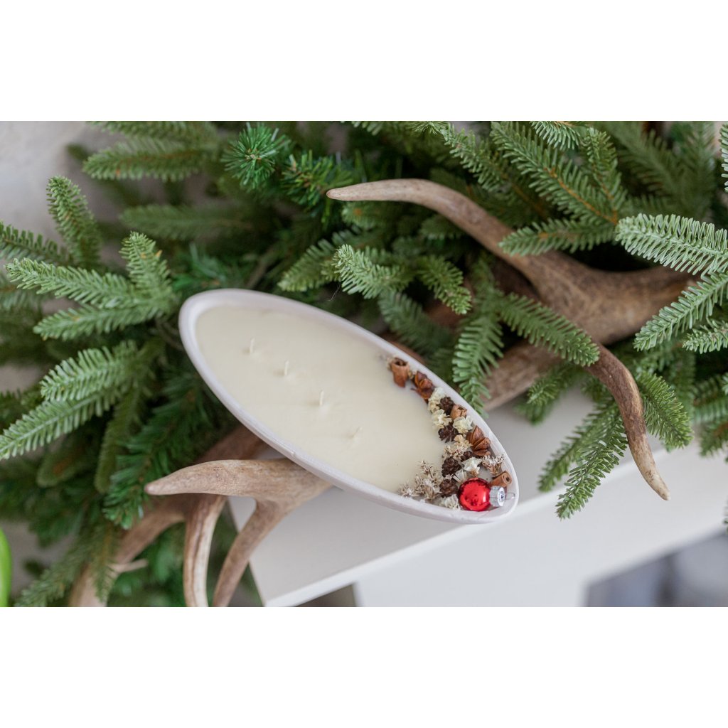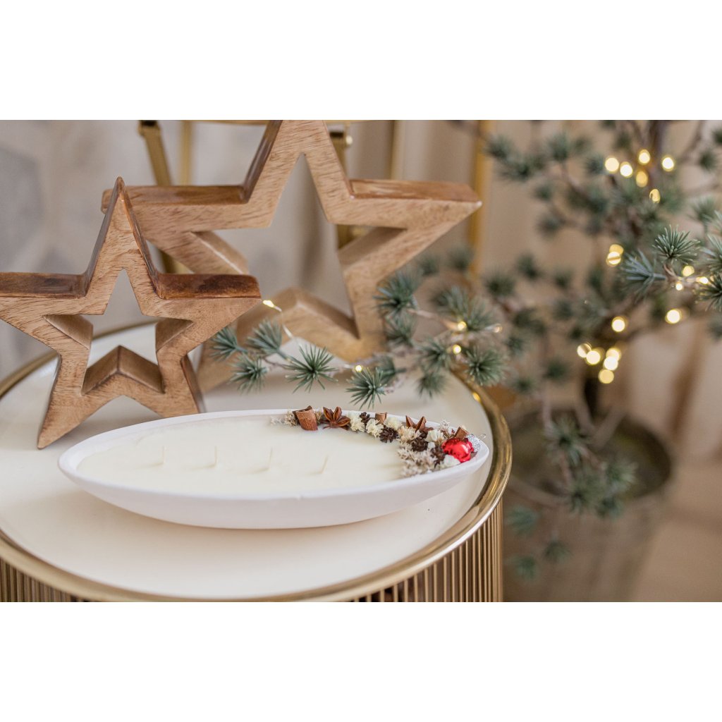 Táto sójová sviečka dokonalo vyladí Vašu vianočnú náladu. Dekoráciu z badyánu, škorice, sušených kvetov a vianočnej ozdoby aranžujeme ručne. Typická vianočná vôňa Mandarínka+Klinček+Škorica je vyskladaná z prírodných silíc . Žltkasté sfarbenie vosku preto môže byť spôsobené žlto-oranžovými pigmentami mandarínkovej silice. Počet knôtov: 4. Hmotnosť vosku: 250 g. Minimálna doba horenia: 15-18 hodín.